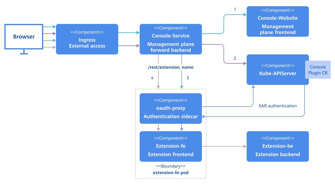 - Line 4 indicates that the frontend obtains the backend data of the browser extension through JavaScript. The frontend forwards the request to the oauth-proxy sidecar through the extension route of Console-Service. After the authentication and authorization operations are successful, the request is forwarded to the frontend service of the extension. Then, the frontend service forwards the request to the backend service through the configured nginx.conf.