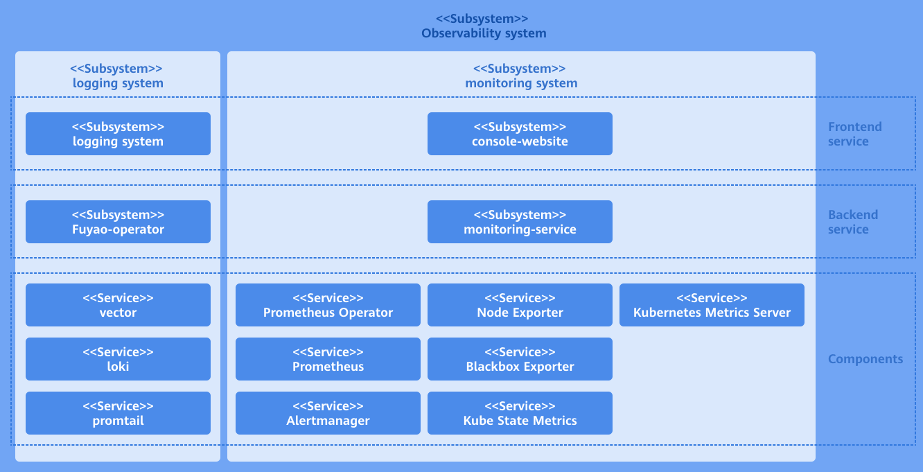 As an ecosystem extension of openFuyao, the log component consists of three parts: log backend layer, log UI layer, and open-source software layer.