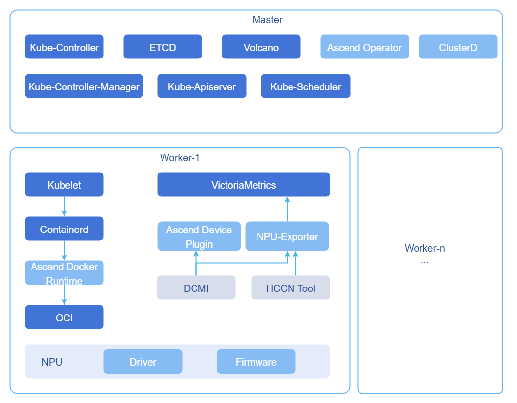 本文旨在提供使用Ascend Deployer工具部署MindCluster组件的方法,并在此基础上使用监控组件VictoriaMetrics实现对NPU工作状态的监控,以确保超大规模集群NPU的实时状态采集、上报与性能分析,保障训练与推理任务全程可控、可观测、可回溯。