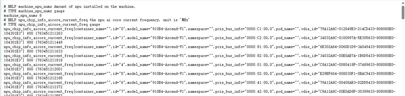 http://<ip>:8082/metrics即可获取NPU监控指标。图2 metrics页面NPU监控指标