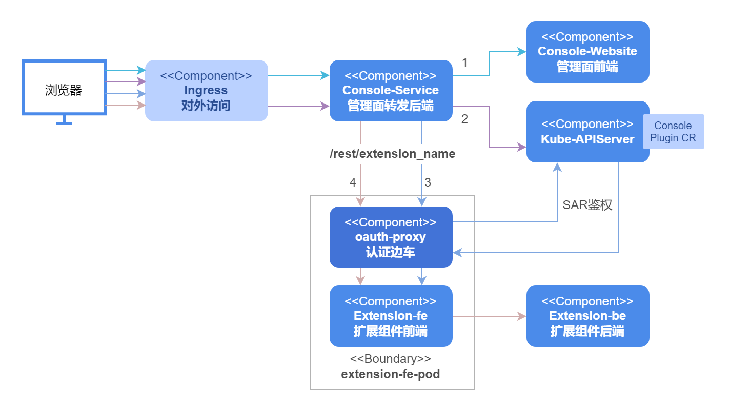 - 线条3代表浏览器获取挂载信息和扩展前缀后,通过Console-Service的扩展路由转发请求到扩展组件前端pod中的oauth-proxy边车上,oauth-proxy会解析用户token获得用户信息,然后委派给kube-apiserver通过鉴权后方可访问扩展组件前台页面,返回给浏览器。
