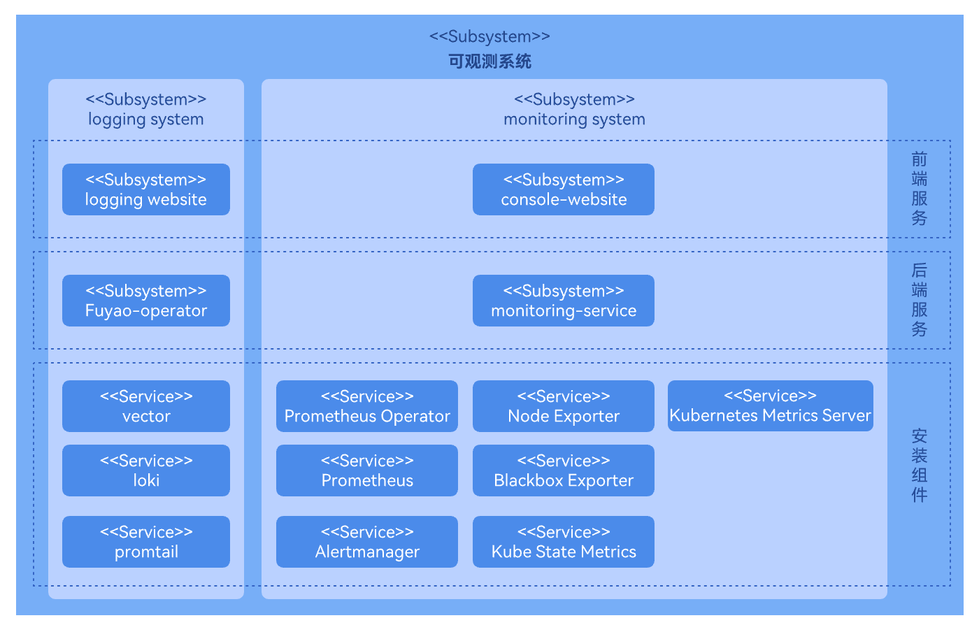 日志组件作为openFuyao的生态扩展组件由三部分组成:日志后端层,日志UI层,开源软件层。