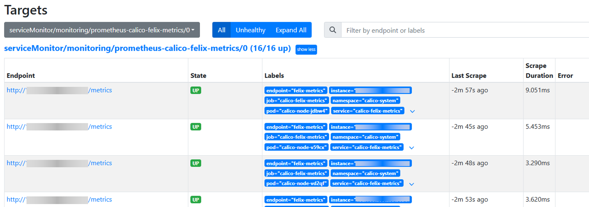 sh# kubectl apply -f prometheus-ServiceMonitorCalico.yaml servicemonitor.monitoring.coreos.com/felix-metrics created servicemonitor.monitoring.coreos.com/typha-metrics created servicemonitor.monitoring.coreos.com/kube-controllers-metrics create检查target。